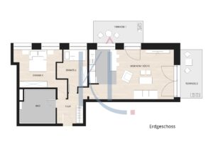 Das Wohnzimmer bietet zwei direkte Zugänge zur jeweiligen Terrasse; im Schlafzimmer könnte noch ein weiterer Arbeits-/Gästebereich entstehen.